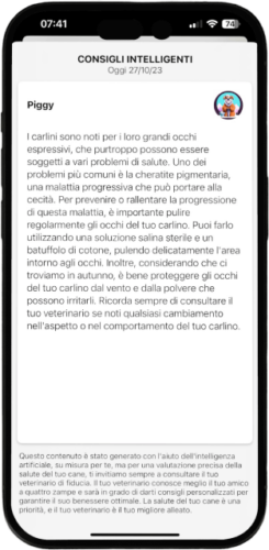Grazie alla potente Intelligenza Artificiale, ogni giorno la sezione ‘Consigli Intelligenti‘ ti offre consigli personalizzati per prenderti cura al meglio del tuo caro amico a quattro zampe. Riceverai suggerimenti e informazioni preziose su argomenti di salute, cura e benessere per i tuoi PPET. Mantieni il tuo animale domestico in salute e felice con consigli su misura, forniti direttamente dall’IA di PPET Addicted.